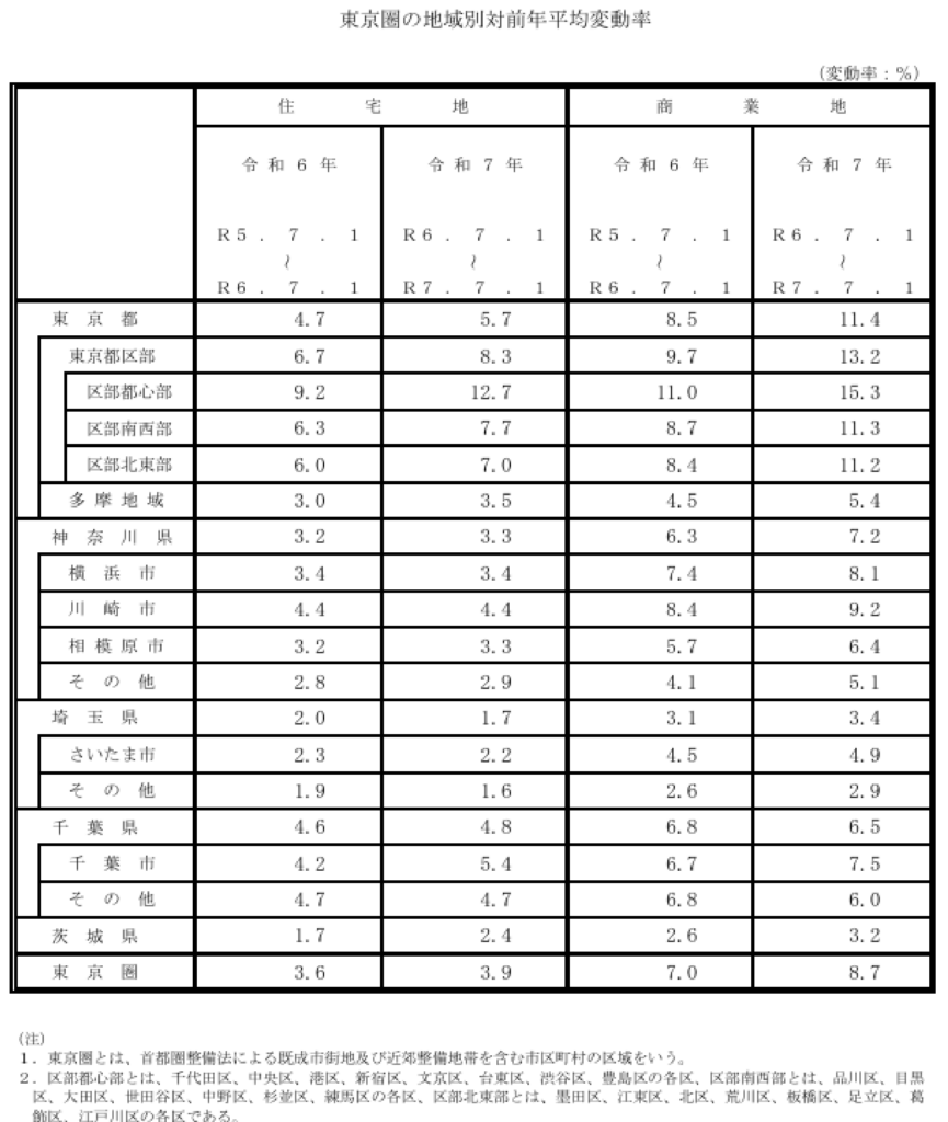 区部住宅地の平均変動率は+8.3%と、全国・地方圏を大きく上回りました。
