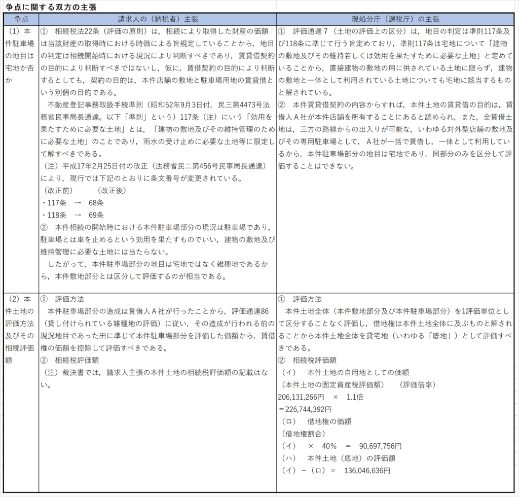 以上が本件土地の概要です。このように、一見すると店舗用地と駐車場用地が一体となって利用されている状況ですが、相続税の土地評価上は**「駐車場部分の地目(用途区分)をどのように判定すべきか」**が大きな争点となりました。次章以降で、この争点について税務当局と納税者(請求人)の主張、および不服審判所(国税不服審判所)の判断内容を詳しく見ていきます。