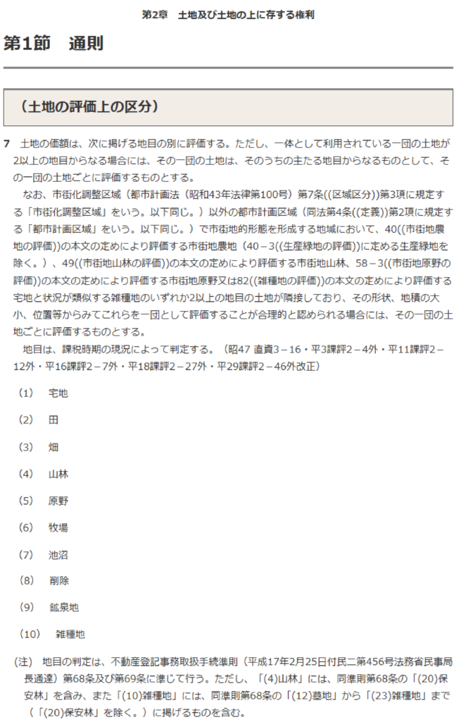 また、評価基本通達7項のただし書きでは、「一体として利用されている一団の土地が2以上の地目からなる場合には、その一団の土地はそのうちの主たる地目からなるものとする」と規定されています。つまり、現実には複数の地目(用途区分)にまたがる土地であっても、ひとまとまりの一体利用地であれば主な利用目的に従った地目で評価するというルールです。