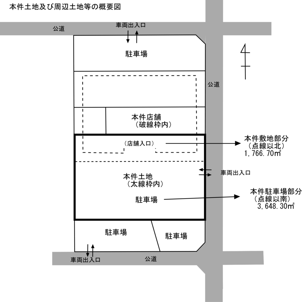 本件土地とその利用状況の概略図。5235㎡の土地のうち、建物敷地部分が約1766㎡、駐車場部分が約3468㎡を占めており、全体として店舗敷地および専用駐車場として利用されている。周囲の他の土地も同じテナント会社により一括で借り上げられ、同様に店舗敷地・駐車場として利用されている。