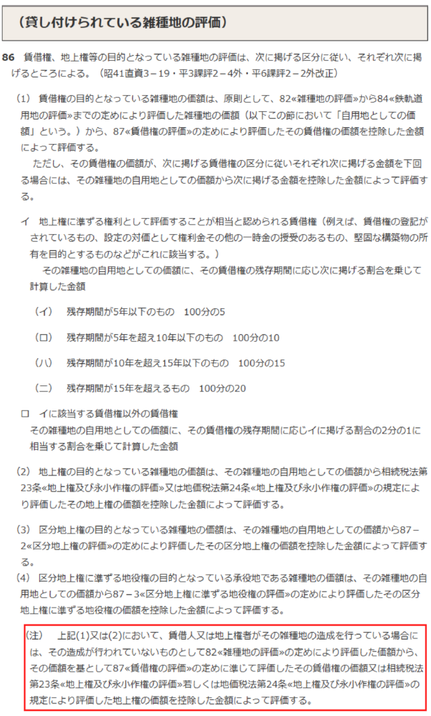 - 造成前の地目評価は限定的:借地人が土地を造成していた場合でも、その土地を独立評価する場合に限り「造成前の状態」で評価できる特例(通達86項)がある。一体評価では適用なし。特例適用には厳密な条件があると心得る。