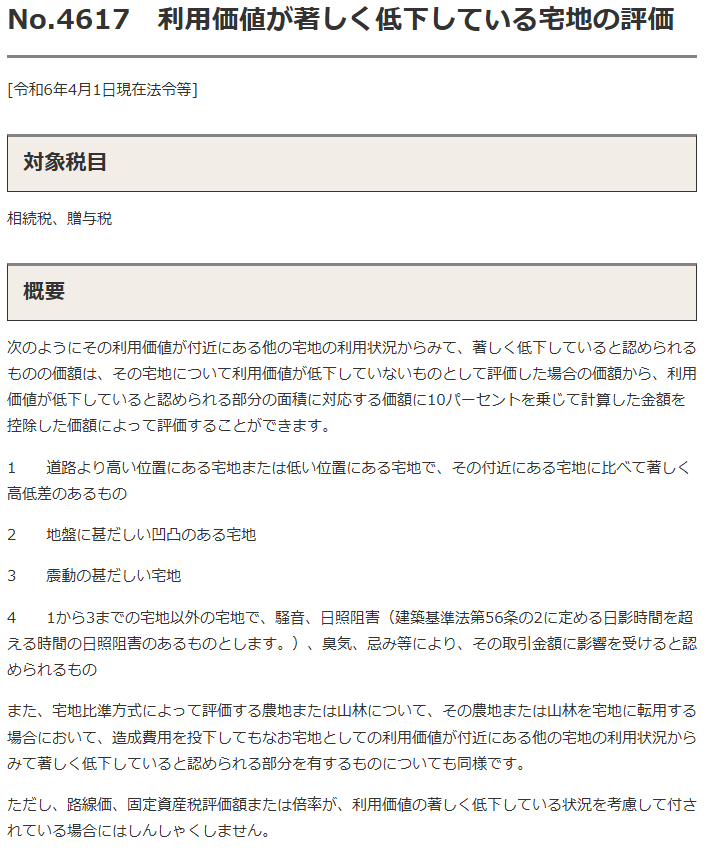 国税庁タックスアンサーNo.4617では、このような土地を**「著しく利用価値の劣る宅地」**と呼び、利用価値の低下に応じて評価額を減額できると定めています。