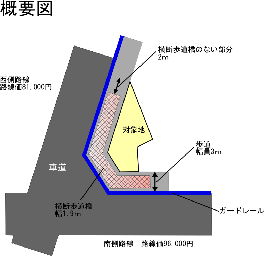○対象地が接面する南側及び西側路線のうち、横断歩道橋が設置されていない部分の距離は、西側路線の2.0m