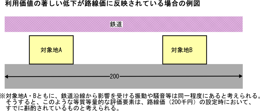 減価要因が広域的(帯状)で、路線価設定時にすでに考慮されている場合は、個別に補正を行うと二重減額となるため適用しない。鉄道沿線や高速道路沿いなどは、このケースが多い。