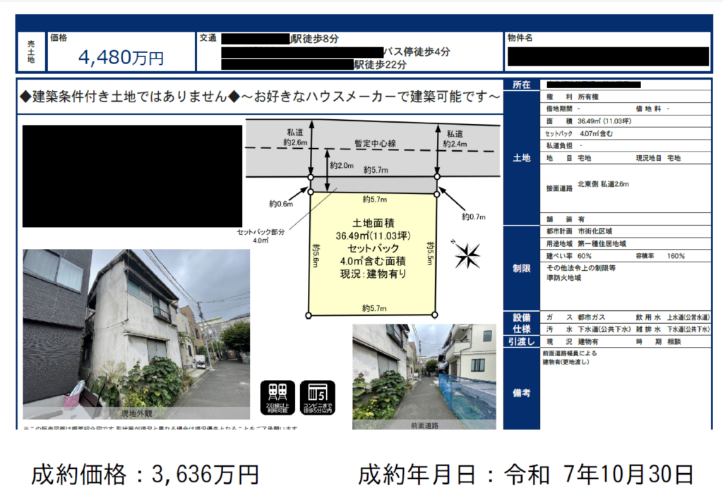 | 2. ポータルサイト(SUUMO・HOME’S 等の売出情報) | △〜○ | ◎ | ◎(無料) | 近隣の売出動向や地形・接道の状況を写真で確認したい場合 | 売出価格=実勢価格ではない(希望価格)/未成約物件の価格が含まれる |