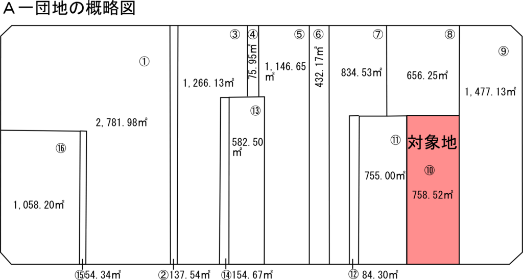 - 案B: A一団地とB一団地の両方を合わせた広大な宅地全体を評価単位とみなす。共同利用義務街区として指定され一体的利用が想定された土地群であることから、道路を挟んでも全体を一つの画地と見立てて評価する方法。