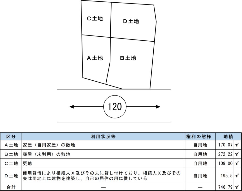 ○相続人Yは、相続人Xが取得し利用することとなるD土地から路線価120,000円が付されている道路に至る手段として、その必要最小限の範囲内でB土地上を通行することを容認するものとする。